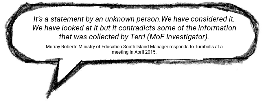 TURNBULL outlines to me their solicitor has spoken to an independent person who has witnessed children being put into the safe room at the school and has taken a statement from this person which has been forwarded to the Ministry of Education approximately two weeks ago.