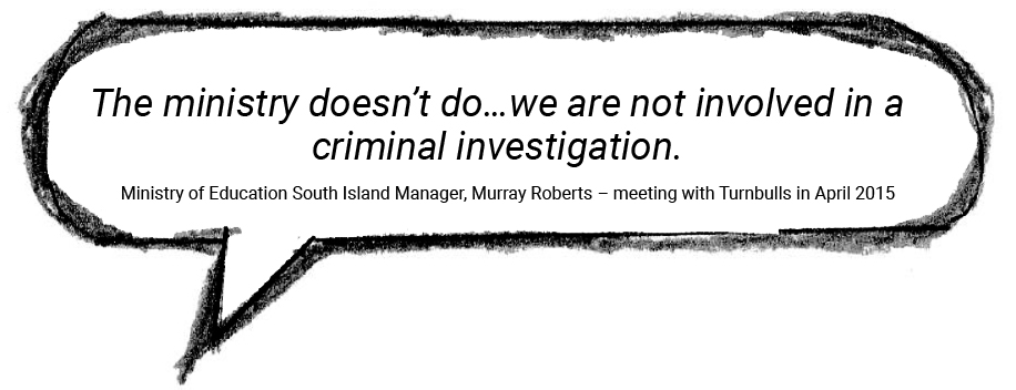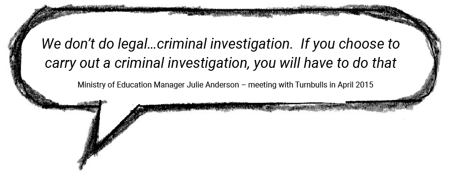 In mid-April 2015 Victoria Turnbull called Detective Wyatt inquiring about why the Police did not investigate their 2014 reporting of suspected abuse of children and young people with disabilities at Ruru Specialist School.